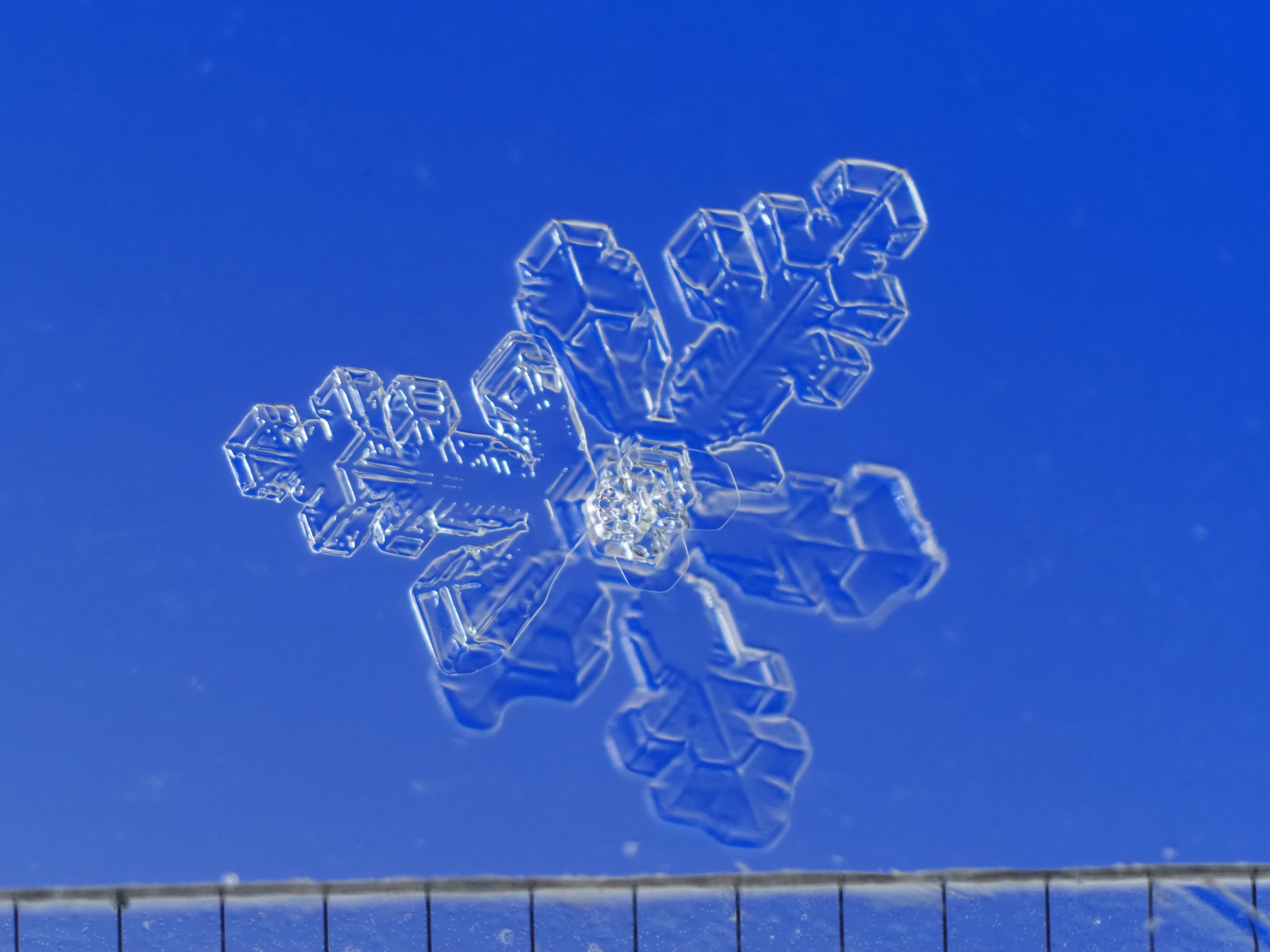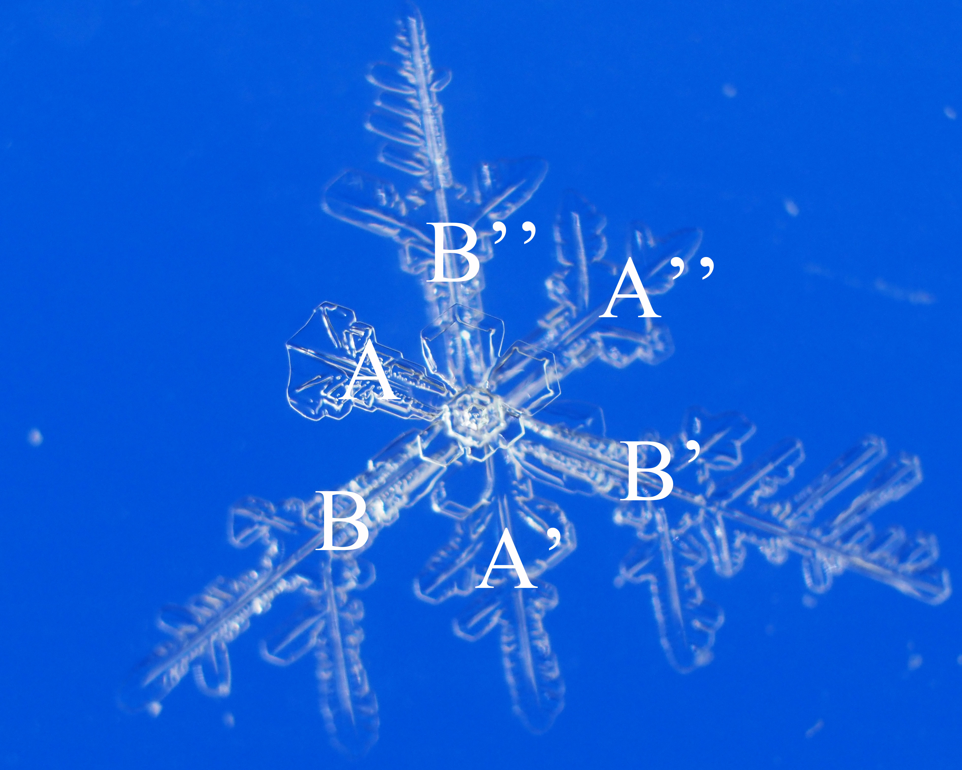 三回対称の六花は一見、枝の長さが異なる2つの3花がて組み合わさって形成されるという解釈が分かりやすいかもしれないが、実際にはこの結晶の場合、図1,その拡大図の図2のとおり、左上方向の1花とそれ以外の5花から出来ている事が分かる。