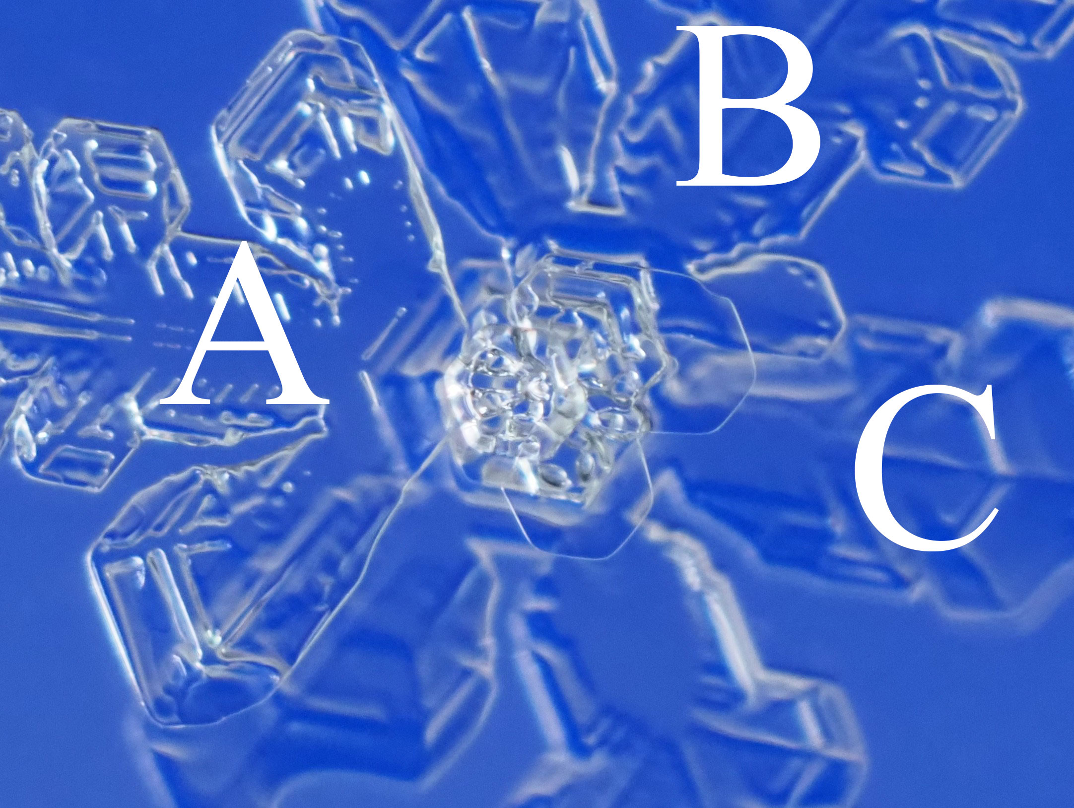 この結晶は図2のA、B,Cの三枚の雪結晶から出来ている事が分かる。